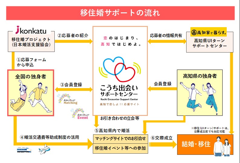 ②日本婚活支援協会から情報提供を受けたこうち出会いサポートセンターが、移住婚の希望者のお相手探しや交通費のサポートなどを実施。