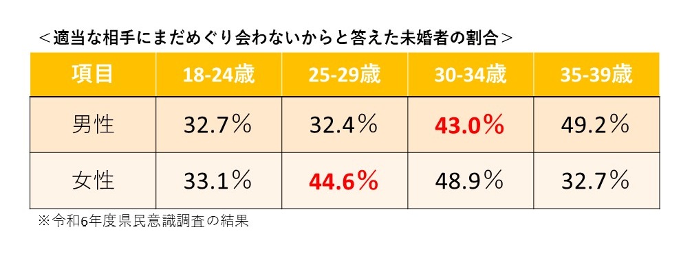さらに、関連する県民意識調査によると、未婚理由として「適当な相手にまだめぐり会わないから」と答えた人の割合は、男性は30歳、女性は25歳を境に上昇しています。