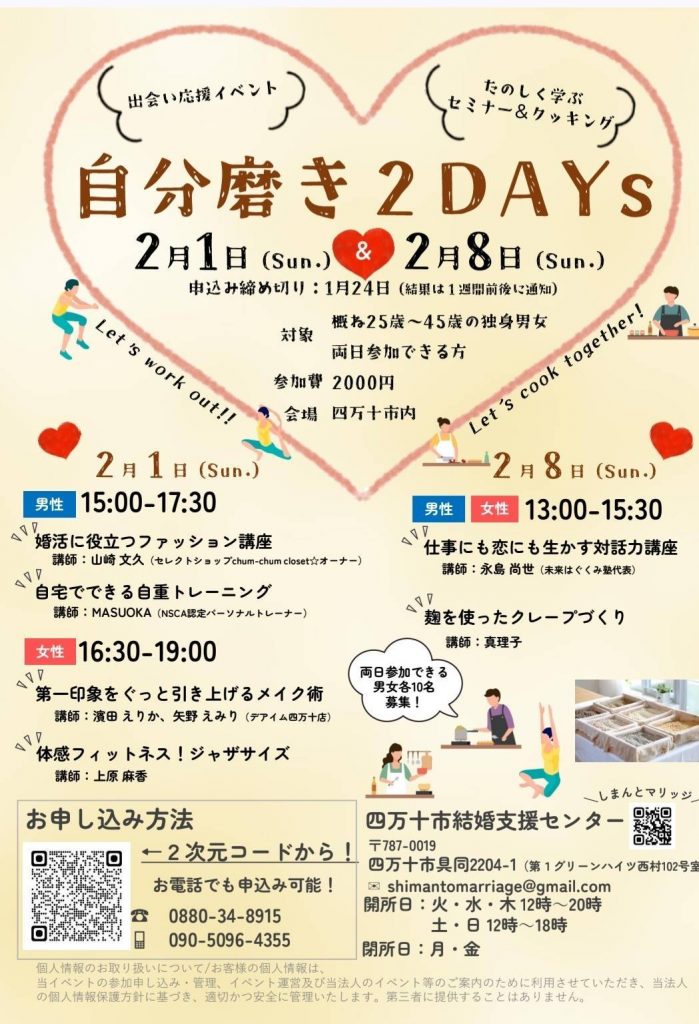 2/1・2/8開催「自分磨き2DAYS~セミナー&クッキング~」(しまんとマリッジ主催)のお知らせ