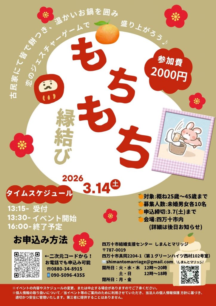 3/14開催「もちもち縁結び」(しまんとマリッジ主催)のお知らせ