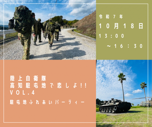 イベント詳細 | 日本の平和を守る陸上自衛隊員との出会いイベントです。 普段はあまり入ることがないであろう高知駐屯地内をツアーします! 隊員と一緒にまわるので、普段の訓練や生活の様子などが垣間見れるかも?! 自衛隊車両に乗って駐屯地内を走る車両乗車体験もあります! 1対1のプロフィールトーク、駐屯地ツアー中、カフェタイムなど、お話しできる場面もしっかりあります。 カフェタイムには、スイーツをご用意します! |
