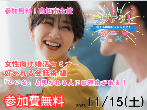備考 | ※参加決定方法、先着順 ※同日イベントの参加申し込みはできません。 ※同時に申し込めるイベントは3件までです。 ※お申し込みの際にいただいた個人情報は、本イベントの運営のために必要な範囲で、本イベントの主催者と高知県との間に限って共同利用させて頂く場合がございます。個人情報の取扱いに関する一般的な事項については、プライバシーポリシーをご参照ください。 ※ドメイン指定・受信拒否の設定をされている方は「pref.kochi.lg.jp」のドメイン指定を解除し、電話及びメールは必ず通じるものをご記入ください。(参加確定メールが届きません。) ※当日ご本人であることを確認できる写真付き身分証(運転免許証・パスポート・写真入り住基カード)をご提示下さい。 ※本セミナーは、独身の方を対象としています。既婚者の方は参加をご遠慮ください。 ※開始時間に遅れないよう、時間に余裕をもってご来場ください。 ※セミナー中の録音・録画・写真撮影は固くお断りします。 ※本セミナーは「高知市ラブアクト推進事業」によりイベント代金が補助されます。セミナー終了後のアンケートにご協力よろしくお願いします。 |
