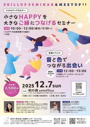 | イベント詳細 | スキルアップセミナーとワークショップで、朝からずっと楽しめるイベントを開催! 午前は、堅苦しくなく気持ちが楽しくなるセミナー。 午後は、音楽とアートのワークショップ。 マッチングなしなので気軽にご参加できます! お友達と一緒のご参加も大歓迎です♪ |