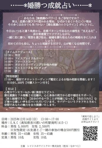 | 参加費用 | 男性:5000円 女性:2500円(女性限定:お友達とご一緒の参加の場合500円割引)/支払い方法:当日支払い ☆複数回のご参加で-500円で参加が可能(MAX1000円まで) |