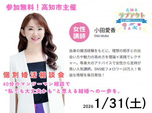 | 備考 | ※参加決定方法、先着順 ※同日イベントの参加申し込みはできません。 ※お申し込みの際にいただいた個人情報は、本イベントの運営のために必要な範囲で、本イベントの主催者と高知県との間に限って共同利用させて頂く場合がございます。個人情報の取扱いに関する一般的な事項については、プライバシーポリシーをご参照ください。 ※ドメイン指定・受信拒否の設定をされている方は「pref.kochi.lg.jp」のドメイン指定を解除し、電話及びメールは必ず通じるものをご記入ください。(参加確定メールが届きません。) ※当日ご本人であることを確認できる写真付き身分証(運転免許証・パスポート・写真入り住基カード)をご提示下さい。 ※本セミナーは、独身の方を対象としています。既婚者の方は参加できません。 ※開始時間に遅れないよう、時間に余裕をもってご来場ください。 ※セミナー中の録音・録画・写真撮影は固くお断りします。 ※本セミナーは「高知市ラブアクト推進事業」によりイベント代金が補助されます。セミナー終了後のアンケートにご協力よろしくお願いします。 |